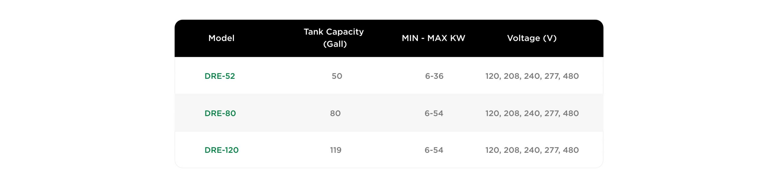 • Available in 50, 80 and 119 gallons, with input options ranging from 6 kW to 54 kW.